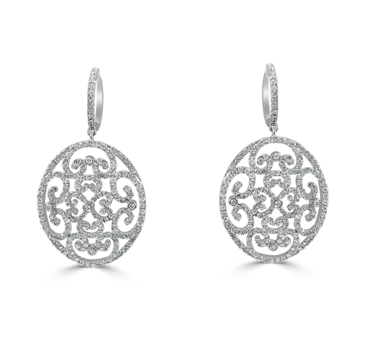 14kt white gold diamond drop earrings. Delicate diamond swirls hangs from a diamond huggie.
