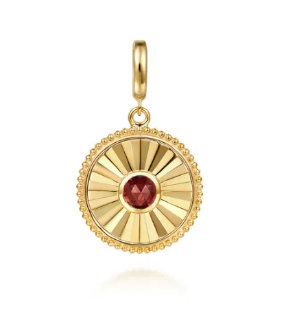 14kt yellow gold fluted pendant featuring a bezel set garnet and milgrain trim. The bale opens and closes so the pendant can be worn in so many ways!